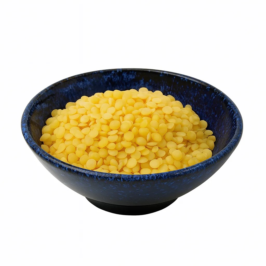 Cera d’api naturale di colore giallo in pratiche pastiglie – base classica che dona consistenza e proprietà protettive ai cosmetici fai-da-te.